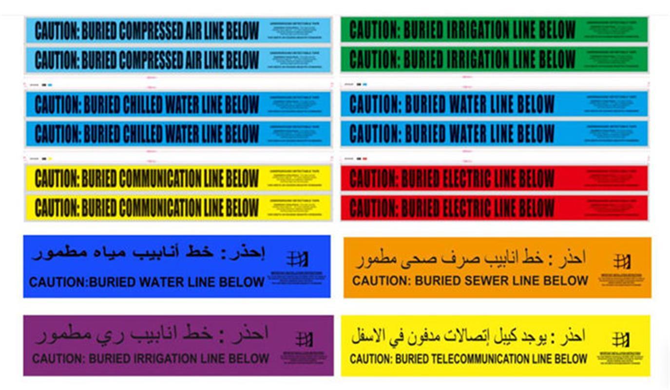 Dây băng cảnh báo dưới lòng đất có thể phát hiện được là một hỗn hợp PET / foil / poly đặc biệt.Sự pha trộn tuyệt vời này (với polyester) cung cấp đặc điểm sức mạnh đặc biệt khi so sánh với các loại băng cảnh báo có thể phát hiện được polyethylene khácThông điệp màu đen đậm trên nền có mã màu APWA của nó được xử lý để không bị suy giảm hoặc phai khi tiếp xúc với kiềm, axit và hoặc bất kỳ yếu tố phá hoại nào khác dưới lòng đất.